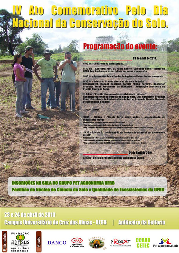 O 4º Ato Comemorativo pelo Dia Nacional da Conservação do Solo foi promovido pelo Centro de Ciências Exatas e Tecnológicas (CETEC), e fez uma reflexão da necessidade de ações de planejamento do uso e manejo da água e do solo, com tecnologias apropriadas aos ambientes de produção, viabilizando assim a manutenção e melhoria da sua capacidade produtiva, propiciando a produção de alimentos de forma sustentável. A palestra “Plantio direto ao alcance de todos”, que foi ministrada por Manoel Henrique Pereira, foi um dos pontos fortes da 4ª edição do evento. Manoel Pereira, conhecido como Seu Nonô, é Agrônomo, produtor rural, reconhecido como embaixador de uma técnica genuinamente brasileira, o plantio direto, é um dos principais precursores da tecnologia no Brasil e no exterior. Mais de 20 milhões de hectares já são cultivados no sistema de plantio direto no Brasil e a eficiência na conservação do solo e no aumento da fertilidade é especialmente visível. A receita para a transformação baseia-se em ações simples, mas de resultados surpreendentes. Fazer plantio direto significa manter o solo coberto de vegetação, viva ou morta; semear com o mínimo de movimentação de terra, e praticar rotação de culturas, e é essa experiência que ele explicou durante o evento.