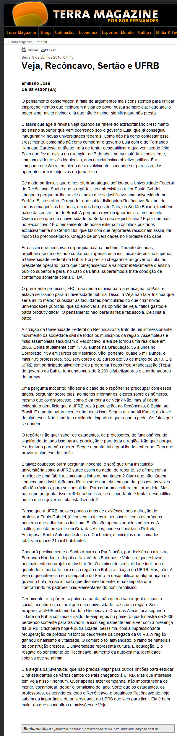Artigo do Professor Emiliano José, Doutor em Comunicação, docente da UFBA, publicado no Terra Magazine.