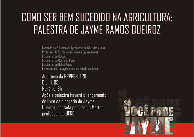 Professor Jayme foi homenageado pela mesa de abertura, composta pelo Professor Joelito Rezende, que foi seu aluno, pelo Pro-reitor de Pesquisa, Carlos Alfredo, pelo Professor Sérgio Mattos, que escreveu sua biografia e pelo Reitor Paulo Gabriel Nacif. Todos falaram da importância de conhecer e rememorar trajetórias como a dele, exemplo de profissional dedicado e competente.