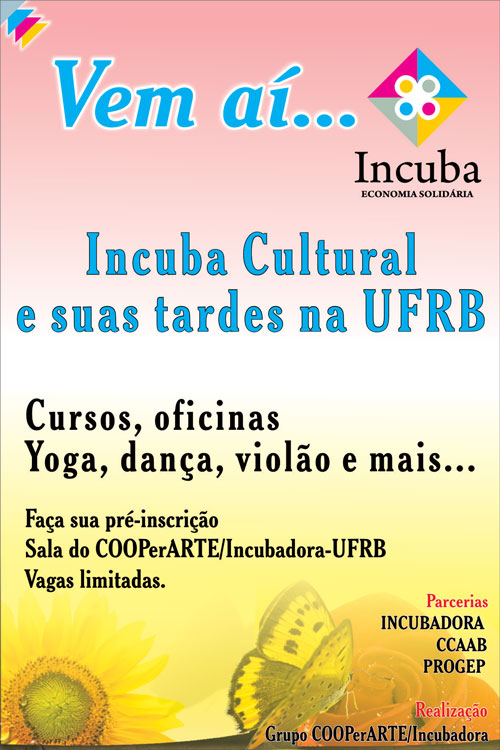 O Grupo COOPerARTE/Incubadora estará realizando em breve o "Incuba Cultural e suas tardes na UFRB". Serão promovidos cursos e oficinas de Yoga, dança, violão e diversos outros. A pré-inscrição está sendo feita na sala do COOPerARTE/Incubadora-UFRB e as vagas são limitadas.