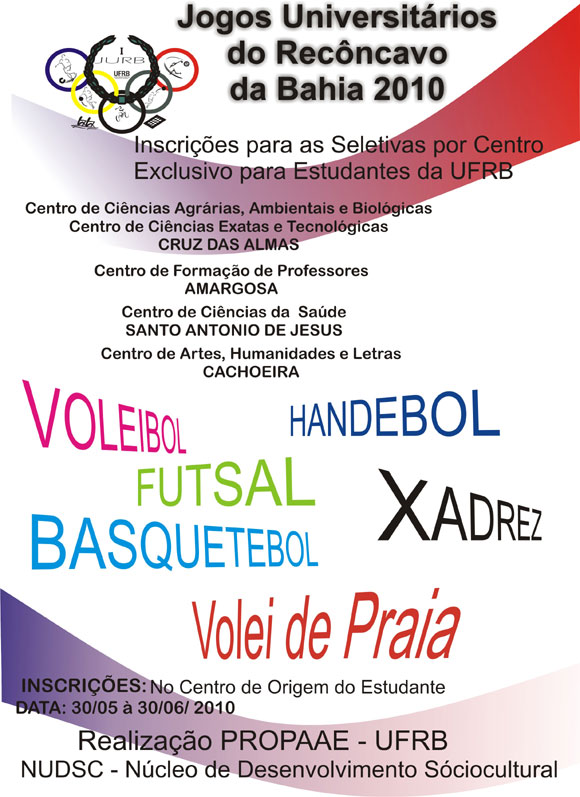 A PROPAAE prorrogou as inscriçães devido a uma nova regra, agora as equipes podem ter até 2 funcionários da UFRB. Os Jogos Universitários do Recôncavo da Bahia vão integrar os quatro Campi em diversas modalidades esportivas. As inscrições podem ser feitas nos Centros de Ensino. O prazo para inscrições vai até 30/07.