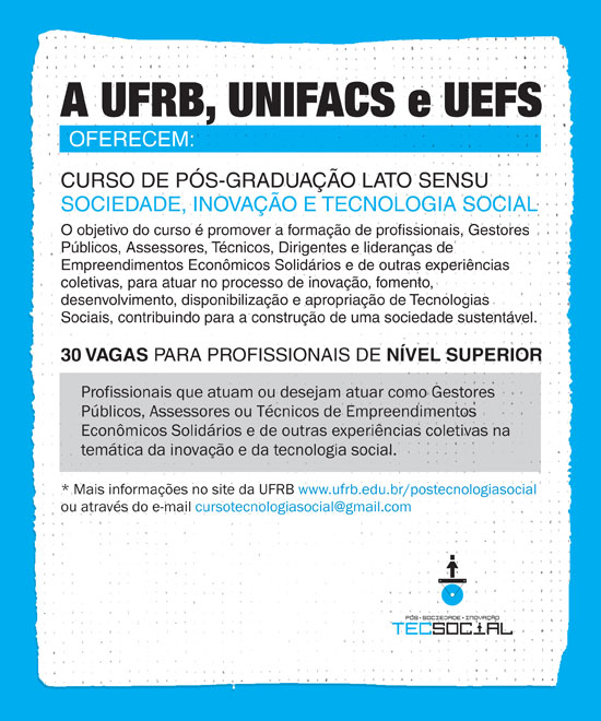 O Curso de Pós-Graduação Lato Sensu Sociedade, Inovação e Tecnologia Social é resultado da parceria entre as Pró-Reitorias de Extensão da UFRB e da UEFS e do Laboratório de Tecnologias Sociais da UNIFACS, com o apoio de instituições vinculadas a movimentos sociais do Comitê de TS da SECTI/BA. Objetiva promover a formação de profissionais para atuar no processo de inovação, fomento, desenvolvimento, disponibilização e apropriação de Tecnologias Sociais. Serão 30 vagas para profissionais de nível superior que atuam ou desejam atuar como gestores públicos, assessores ou técnicos de empreendimentos econômicos solidários e de outras experiências coletivas na temática da inovação e da tecnologia social.