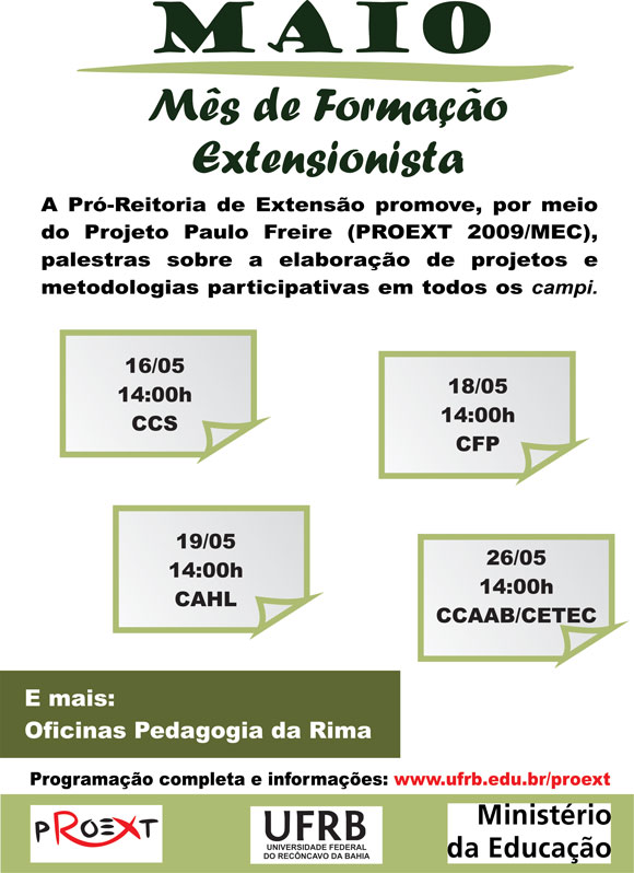 A Pró-Reitoria de Extensão, por meio do Projeto Paulo Freire (PROEXT 2009/MEC), promove no mês de maio palestras e oficinas sobre elaboração de projetos e metodologias participativas em todos os campi. O objetivo é fomentar a criação de espaços de discussão e formação em extensão universitária nos Centros de Ensino da UFRB.