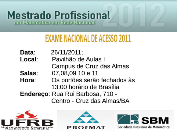 Um dos polos do curso de Mestrado Profissional em Matemática (Profmat), o Centro de Ciências Exatas e Tecnológicas (CETEC) da UFRB torna pública a data da avaliação para ingresso em sua pós-graduação. As provas serão realizadas no sábado, 26 de novembro, nas salas 07, 08, 09, 10, 11 do Pavilhão de Aulas I, campus de Cruz das Almas, a 146 km de Salvador. O candidato deve, no entanto, ficar atento ao horário de fechamento dos portões, às 13h, horário de Brasília.