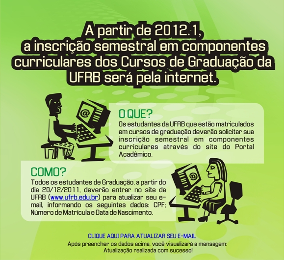 A partir do primeiro semestre de 2012, a inscrição em componentes curriculares em cursos de graduação da Universidade Federal do Recôncavo da Bahia (UFRB) será pela internet. A inscrição online é um importante passo da modernização dos processos da Universidade e está sendo coordenado pela Superintendência de Regulação e Registros Acadêmicos, com apoio da Pró-reitoria de Graduação e da Coordenação de Tecnologia da Informação.