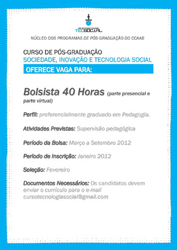 Já a inscrição ocorre durante o mês de janeiro, através do envio de currículo do candidato para o email Este endereço de email está sendo protegido de spambots. Você precisa do JavaScript ativado para vê-lo.. A bolsa refere-se ao trabalho de supervisão pedagógica durante o período de março a setembro de 2012. O aprovado tem que cumprir carga horária de 40h semanais, uma parte presencial e outra virtual.