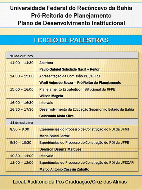 O Pró-reitor de Planejamento, Warli Anjos de Souza, falou que será preciso identificar os atuais problemas para melhor planejar as ações para o futuro da UFRB. Ele demonstrou como está sendo conduzido o trabalho da Comissão do PDI, da qual é presidente, mostrou as leis, resoluções e portarias que tornam o PDI uma exigência legal e disse: ' Além de planejamento estratégico, o PDI é um norteador na hora do MEC avaliar o desempenho da UFRB'.