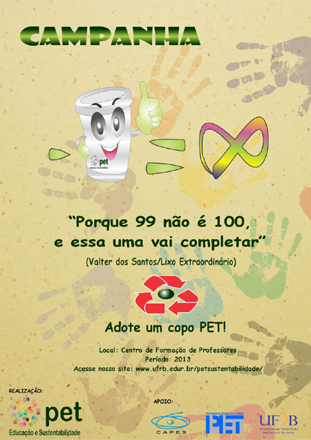 A campanha "Menos um copo descartável é igual a infinito", lançada durante a programação da Semana Reencôncavo 2013.1, no final de janeiro, segue por todo o ano com ações educativas nos centros de ensino. Para os petianos, a campanha se configura como mais um espaço de formação. "Sentimo-nos honrados em contribuir para a construção de uma Universidade mais sustentável", acrescentam.
