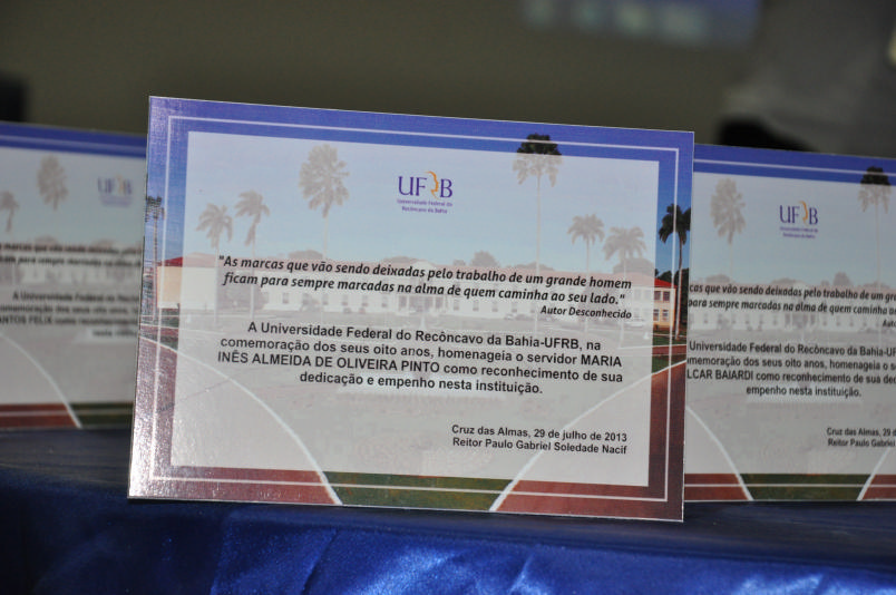 Durante o evento, os servidores e suas famílias receberam uma placa como reconhecimento à dedicação e empenho à Universidade. A homenagem fez parte das comemorações dos oitos anos de UFRB.