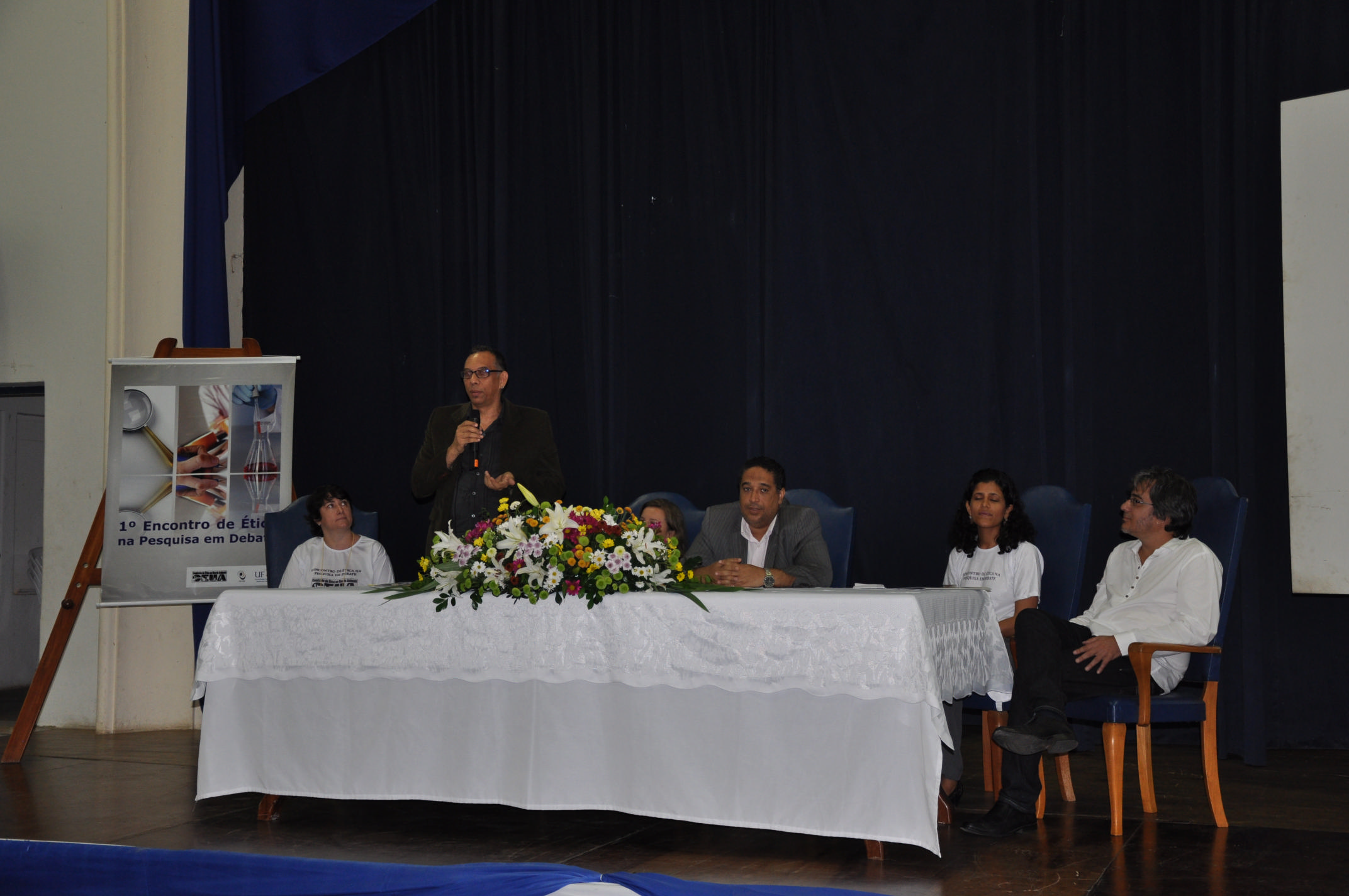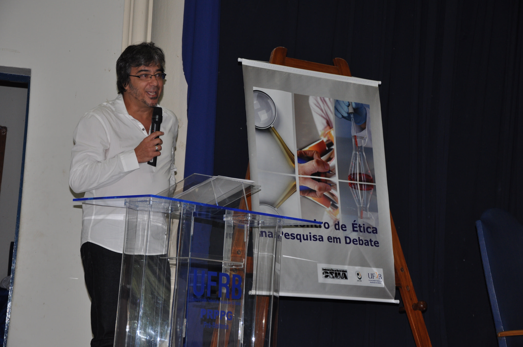 "Espero que possamos avançar sobre esse debate na UFRB, pois a ética é um princípio fundamental dentro das Universidades", destacou o reitor Paulo Gabriel Nacif na mesa de abertura do evento. Ao seu lado, o palestrante Claudio Lorenzo; a coordenadora do CEUA, professora Cecília Poy; a coordenadora do CEP, Deisy Santos; representantes das Pró-Reitora de Extensão, Cláudio Manoel Souza, e da Pró-Reitora de Pesquisa e Pós-Graduação, Franceli Silva.