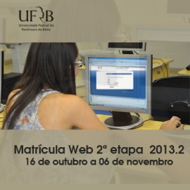 A segunda etapa da matrícula web teve início nesta quarta-feira (16) para os discentes da Universidade Federal do Recôncavo da Bahia (UFRB). Nesta etapa, que fica disponível até o dia 06 de novembro, os alunos veteranos podem solicitar as disciplinas oferecidas pelos centros de ensino para o semestre letivo 2013.2. No Portal Acadêmico, é possível visualizar os horários das disciplinas e escolhê-las de acordo com os pré-requisitos cursados.