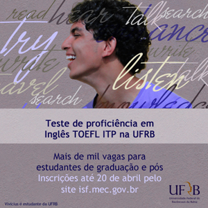 O Programa Inglês sem Fronteiras (IsF) anuncia que estão abertas as inscrições para o teste de proficiência na Língua Inglesa - TOEFL ITP. A Universidade Federal do Recôncavo da Bahia (UFRB) é uma das instituições federais cadastradas como Centro Aplicador do Exame e está oferecendo 1.850 vagas para todos os alunos de graduação e pós-graduação stricto sensu, com matrícula ativa. As inscrições podem ser realizadas até as 23 horas e 59 minutos do dia 20 de abril pelo site isf.mec.gov.br.