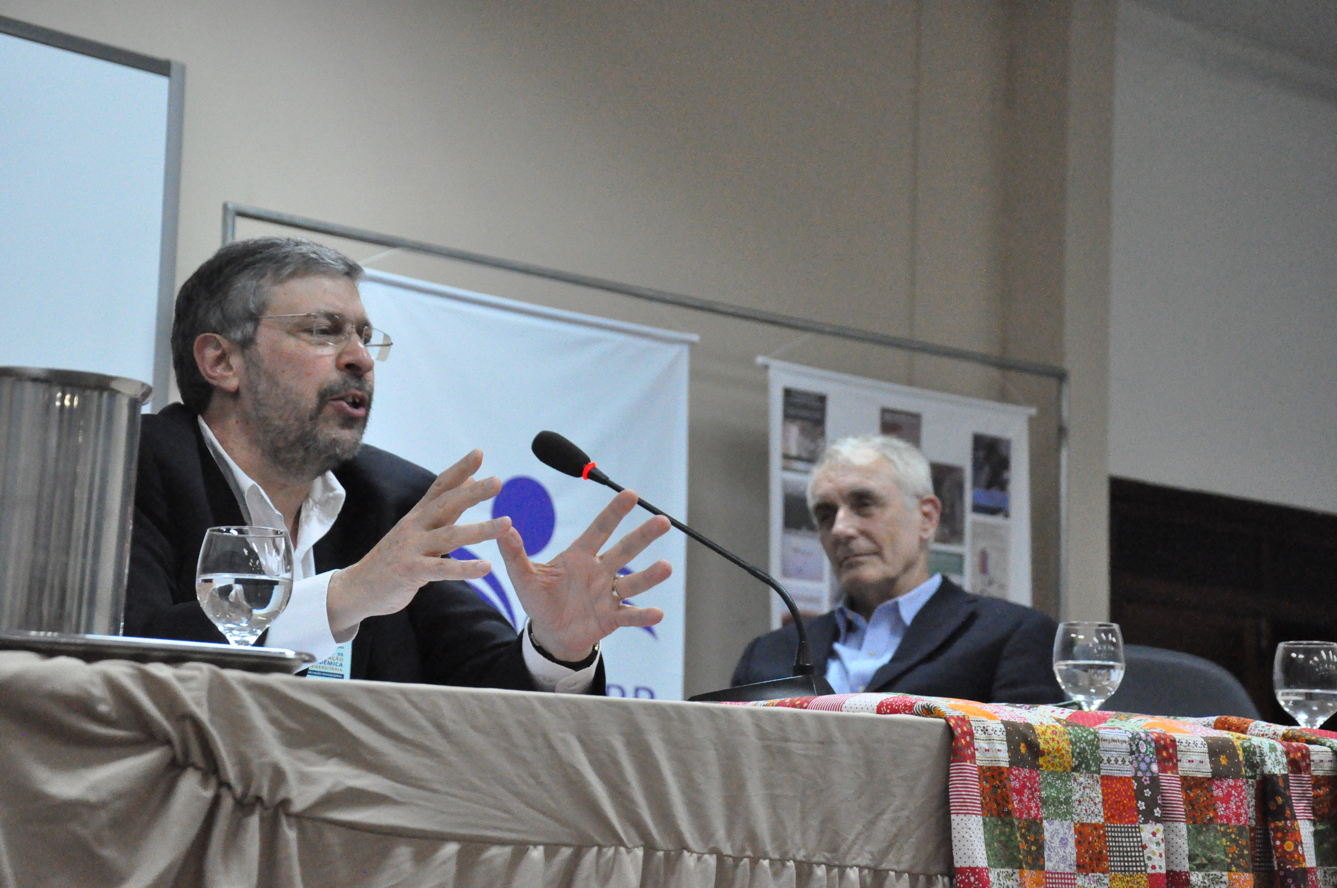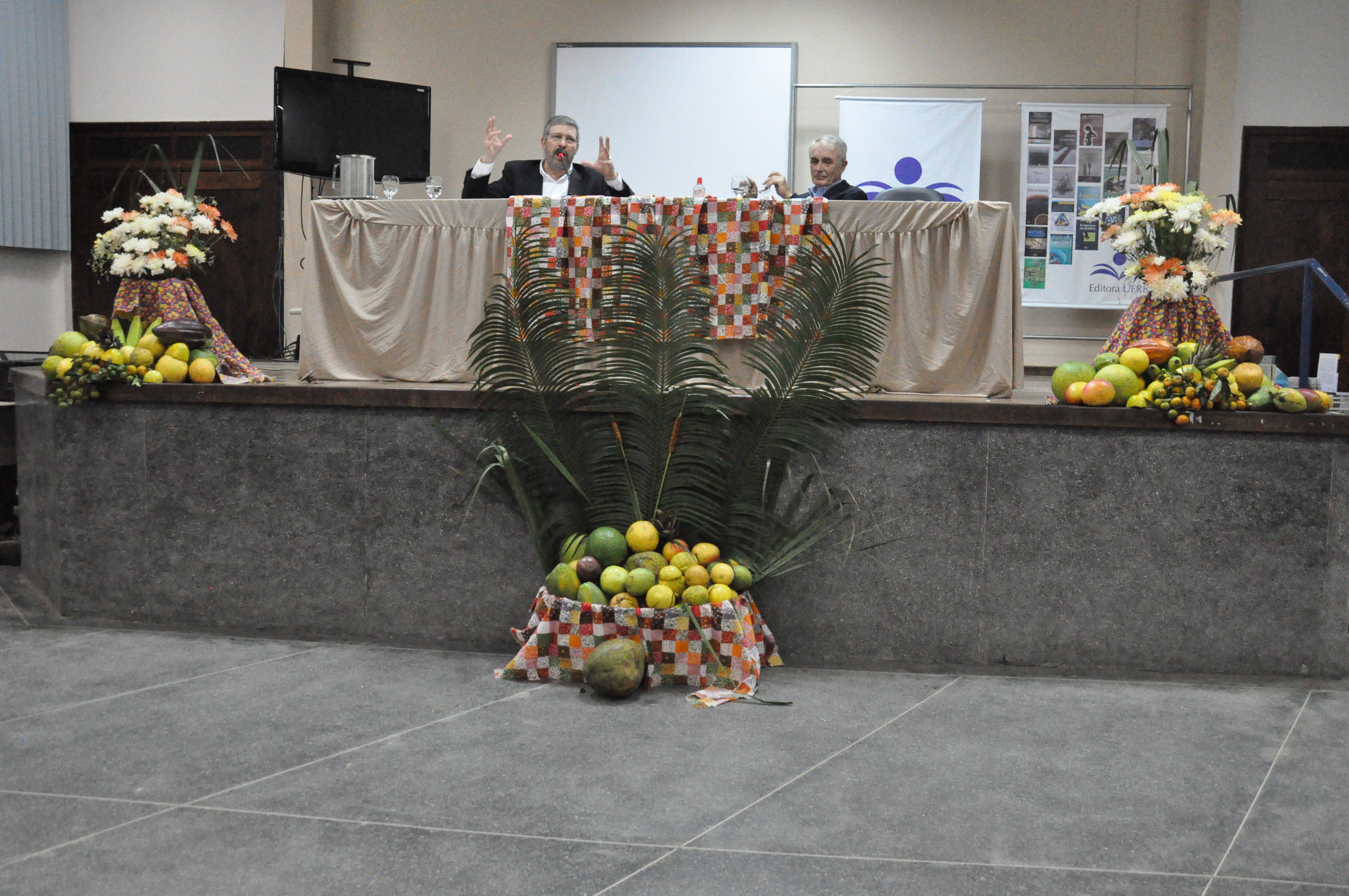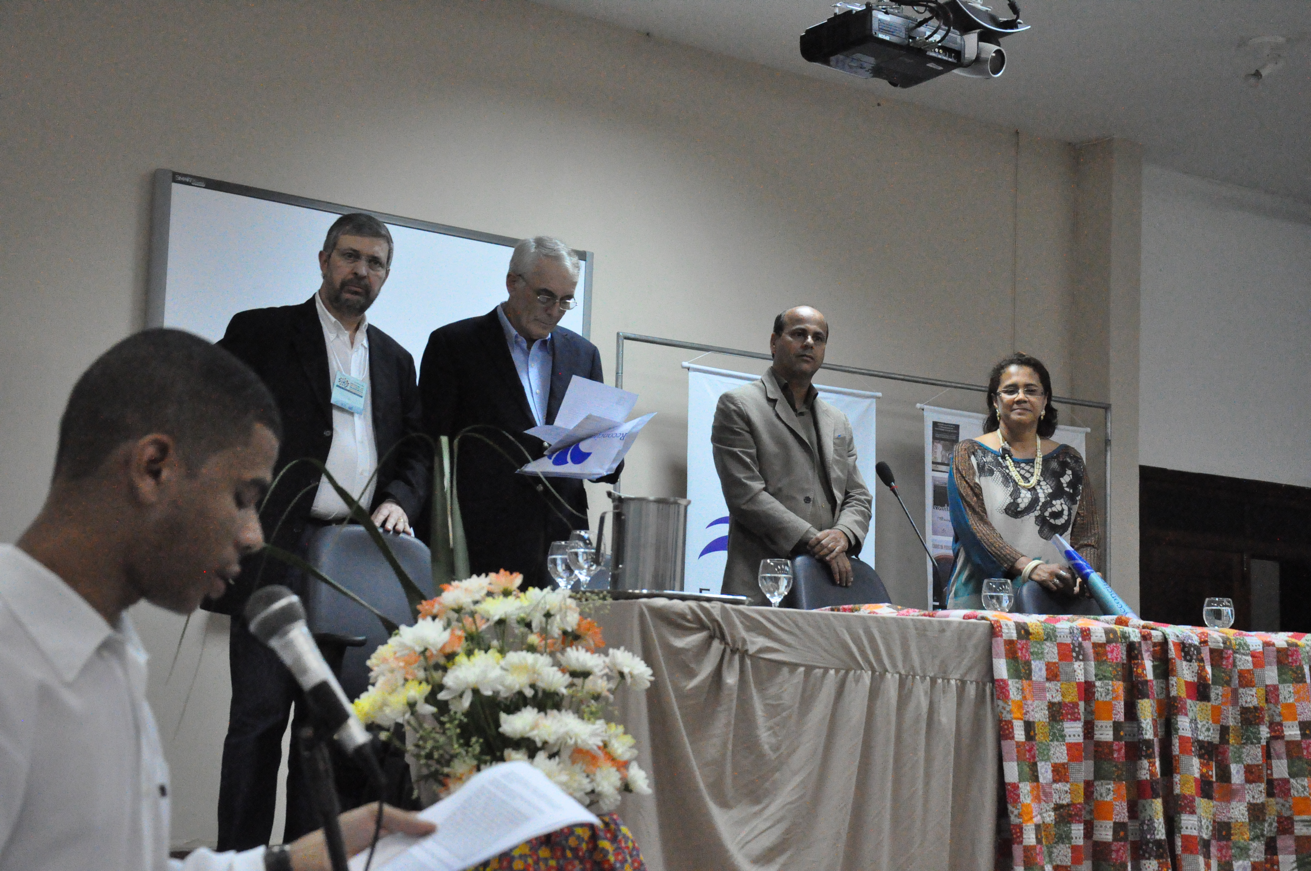 Na mesa de abertura do encontro, a pró-reitora de Pesquisa e Pós-Graduação (PRPPG), Ana Fermino, e o vice-reitor da UFRB, Silvio Soglia, que falou sobre as políticas públicas na área de educação e seu poder de transformar a sociedade. Destacou ainda a parceria com a instituição do palestrante convidado, a Universidade do Minho, com a UFRB. “Temos atualmente 30 servidores técnico-administrativos e professores fazendo doutorado na área de educação por meio desta parceria”, afirmou.
