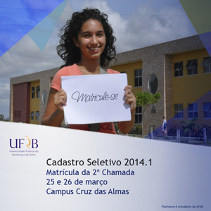 A Universidade Federal do Recôncavo da Bahia (UFRB) divulga a relação de aprovados na segunda chamada do Cadastro Seletivo 2014.1. Nesta etapa, foram convocados os candidatos que optaram por continuar concorrendo às vagas remanescentes do Sistema de Seleção Unificadas (SiSU) do Ministério da Educação. A relação dos aprovados e o boletim de desempenho dos candidatos estão disponíveis online no site do Processo Seletivo da UFRB: www.ufrb.edu.br/prosel.