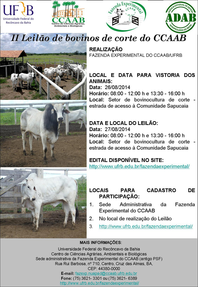 A Universidade Federal do Recôncavo da Bahia (UFRB) promove no dia 27 de agosto o II Leilão de Bovinos do Centro de Agrárias, Ambientais e Biológicas (CCAAB). Constituem objeto da alienação por leilão, especificada pelo Edital Nº 02/2014, 40 bovinos machos (mestiços da raça Nelore), a serem ofertados individualmente. O leilão será realizado das 8h às 12h e das 13h30 às 16h, na sede da Fazenda Experimental do CCAAB - Setor de Bovinocultura, Campus Universitário de Cruz das Almas.
