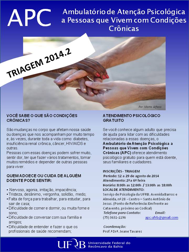 O Ambulatório de Atenção Psicológica a Pessoas que Vivem com Condições Crônicas (APC), vinculado ao Centro de Ciências da Saúde (CCS) da Universidade Federal do Recôncavo da Bahia (UFRB), realiza no período de 12 a 29 de agosto triagem de pacientes para atendimento psicológico gratuito. As vagas são para adultos que precisam lidar com as dificuldades relacionadas a doenças crônicas.