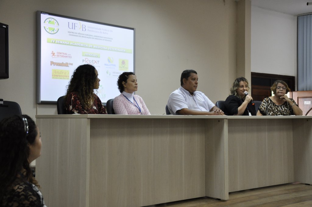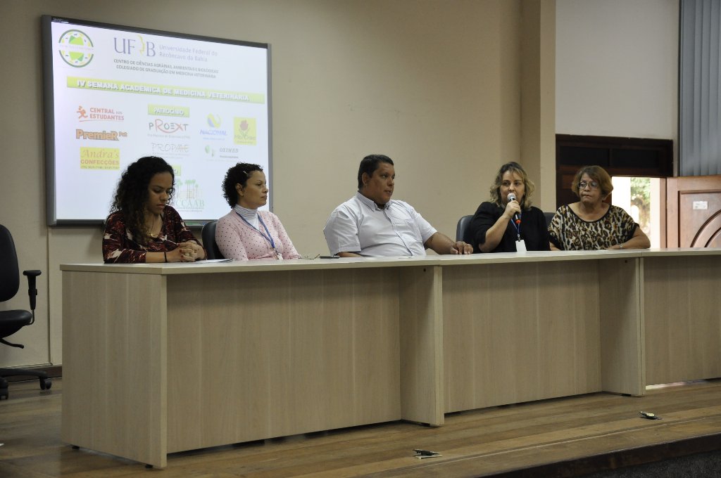 Na mesa de abertura estiveram presentes a secretária-geral do Conselho Regional de Medicina Veterinária do Estado da Bahia (CRMV-Ba), Marilene Caldas; o vice-diretor do Centro de Ciências Agrárias, Ambientais e Biológicas (CCAAB), Josival Souza; a diretora do Hospital Universitário de Medicina Veterinária (HUMV), Ana Paula Peixoto; a vice-coordenadora do curso de Medicina Veterinária da UFRB, Ludmilla Santana, e a coordenadora do evento, Evellin Matos, representando os discentes. Durante a abertura, o vice-diretor Josival Souza parabenizou os estudantes que sempre batalharam para a realização e conseguiram a regularidade do evento; também ressaltou a seriedade e o compromisso que todos demonstram pela busca do conhecimento.