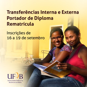 A Universidade Federal do Recôncavo da Bahia (UFRB), por meio da Pró-Reitoria de Graduação (PROGRAD), divulga o edital do processo seletivo para preenchimento das vagas remanescentes dos cursos de graduação, nas modalidades de Transferências Interna e Externa, Rematrícula e Matrícula de Portador de Diploma, com ingresso previsto para o segundo semestre de 2014. Ao todo, são ofertadas 218 vagas, distribuídas em 13 cursos.