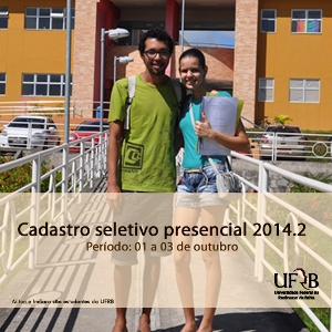 Têm início na próxima quarta-feira, dia 01 de outubro, as inscrições para o Cadastro Seletivo presencial visando à ocupação das vagas remanescentes da Universidade Federal do Recôncavo da Bahia (UFRB), com ingresso no segundo semestre letivo de 2014. As inscrições seguem abertas até o dia 03 de outubro, em todos os campi da UFRB.