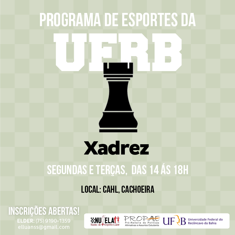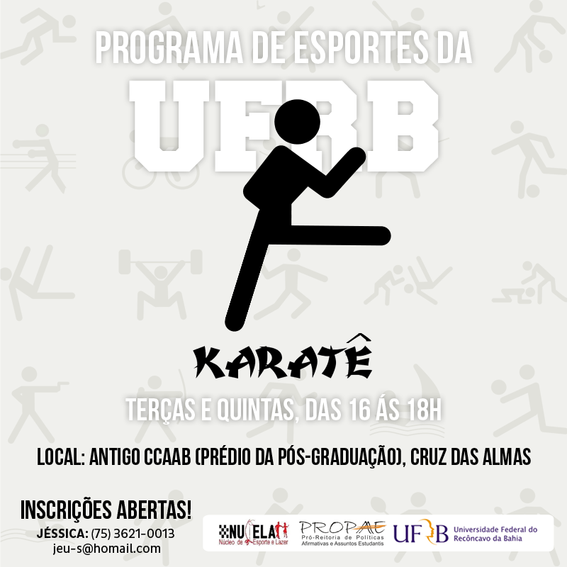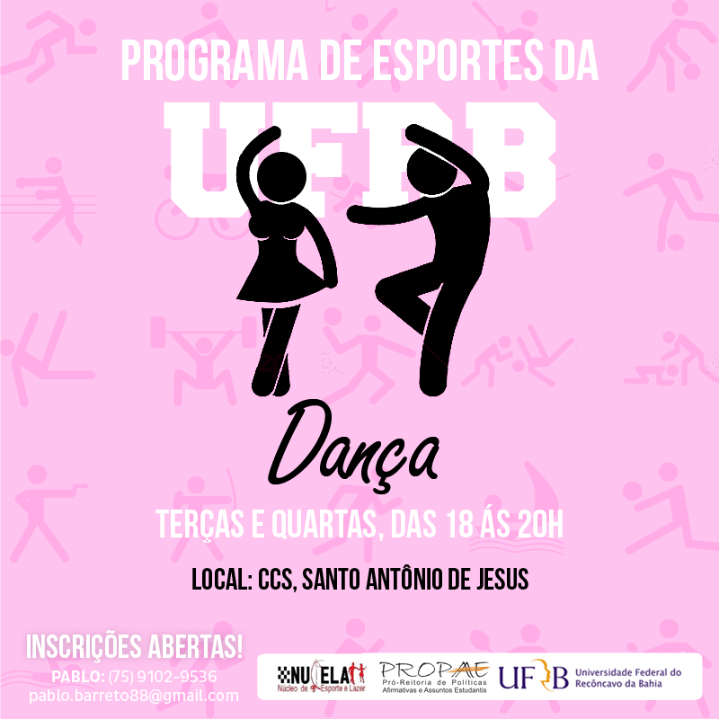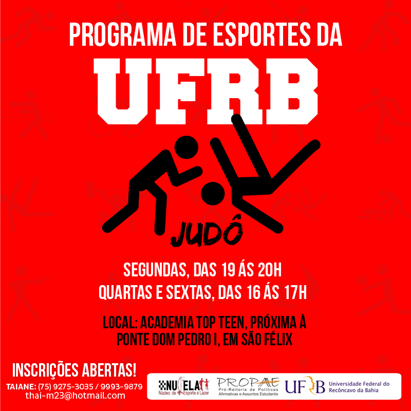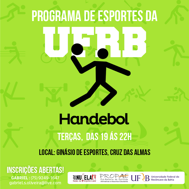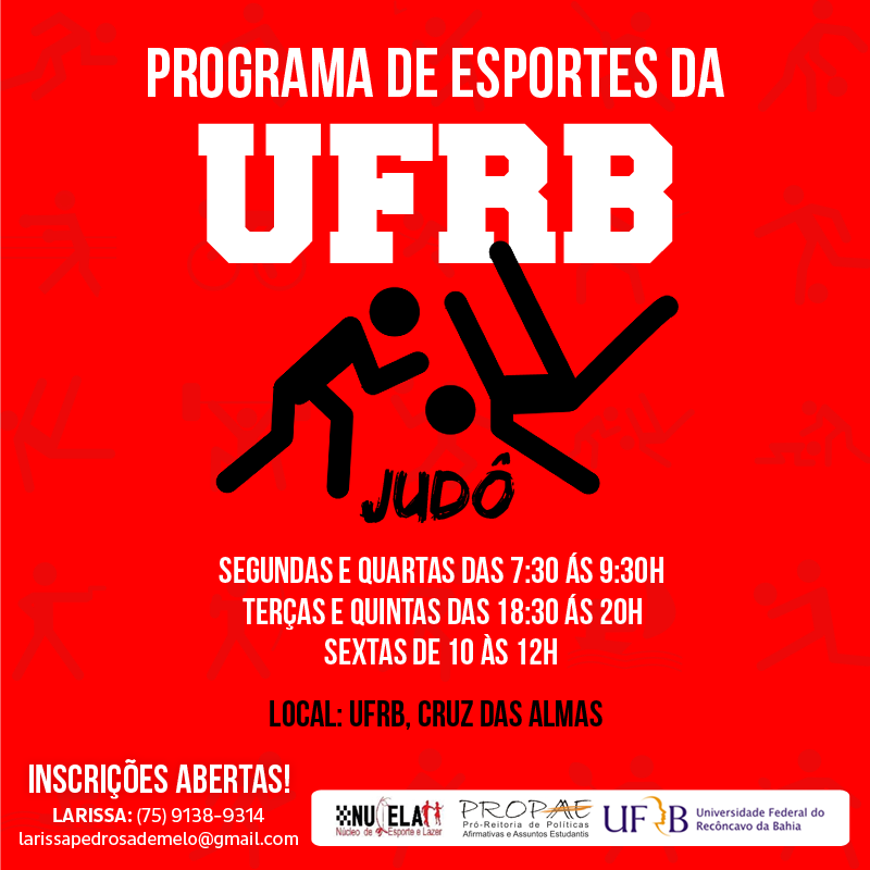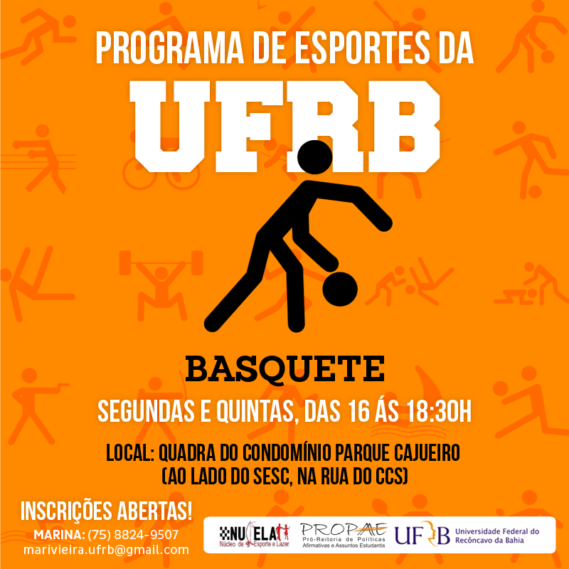 A Universidade Federal do Recôncavo da Bahia (UFRB), por meio do Núcleo de Esporte e Lazer (NUEL) da Pró-Reitoria de Políticas Afirmativas e Assuntos Estudantis (PROPAAE), informa aos participantes de práticas esportivas os locais e os horários das modalidades oferecidas nos campi de Cruz das Almas, Cachoeira e Santo Antônio de Jesus.