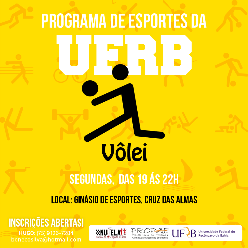 Programa de Esportes - O programa de esportes da UFRB promovido pelo NUEL da PROPAAE tem como objetivo o incentivo à prática e intercâmbio esportivo voltados ao desenvolvimento integral dos estudantes e servidores, visando propiciar qualidade de vida e prática de hábitos saudáveis.