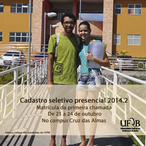 A Universidade Federal do Recôncavo da Bahia (UFRB), por meio da Pró-Reitoria de Graduação (PROGRAD), divulgou na última segunda-feira, dia 13, o resultado da primeira chamada do Cadastro Seletivo 2014.2. Nesta primeira chamada, foram oferecidas mais de 689 vagas em 14 cursos de graduação para ocupação das vagas remanescentes do Sistema de Seleção Unificadas (SiSU). A relação dos aprovados e o boletim de desempenho dos candidatos estão disponíveis online e podem ser conferidos no site do Processo Seletivo da UFRB: www.ufrb.edu.br/prosel.
