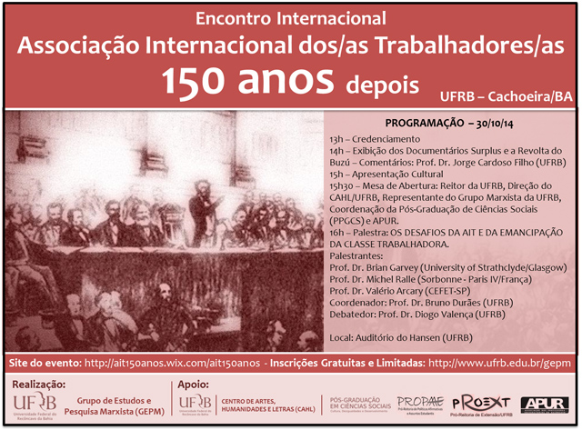 A Universidade Federal do Recôncavo da Bahia (UFRB) promove na quinta-feira, 30 de outubro, o Encontro Internacional em homenagem aos 150 anos da primeira Associação Internacional dos Trabalhadores (AIT). O evento acontece no auditório da Fundação Hansen Bahia, na cidade de Cachoeira, em paralelo com atividades de outras instituições de ensino do País. A programação na UFRB começa a partir das 14h com a exibição e debate dos documentários Surplus, do sueco Erik Gandini, e A Revolta do Buzu, do argentino radicado no Brasil, Carlos Pronzato. O debate será mediado pelo professor do curso de Comunicação da UFRB, Jorge Cardoso Filho.