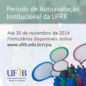 A Comissão Própria de Avaliação (CPA) da Universidade Federal do Recôncavo da Bahia dá início a mais uma etapa do processo de Autoavaliação Institucional (2012-2014). Toda a comunidade acadêmica pode se manifestar avaliando a Universidade a partir do preenchimento de questionários que ficarão disponíveis no período de