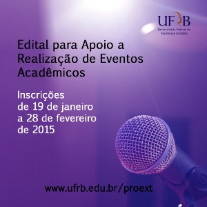 A Pró-Reitoria de Extensão (PROEXT) da Universidade Federal do Recôncavo da Bahia (UFRB) divulga o Edital de Apoio a Realização de Eventos Acadêmicos. As datas para submissão de propostas são de 19 de janeiro a 28 de fevereiro de 2015.