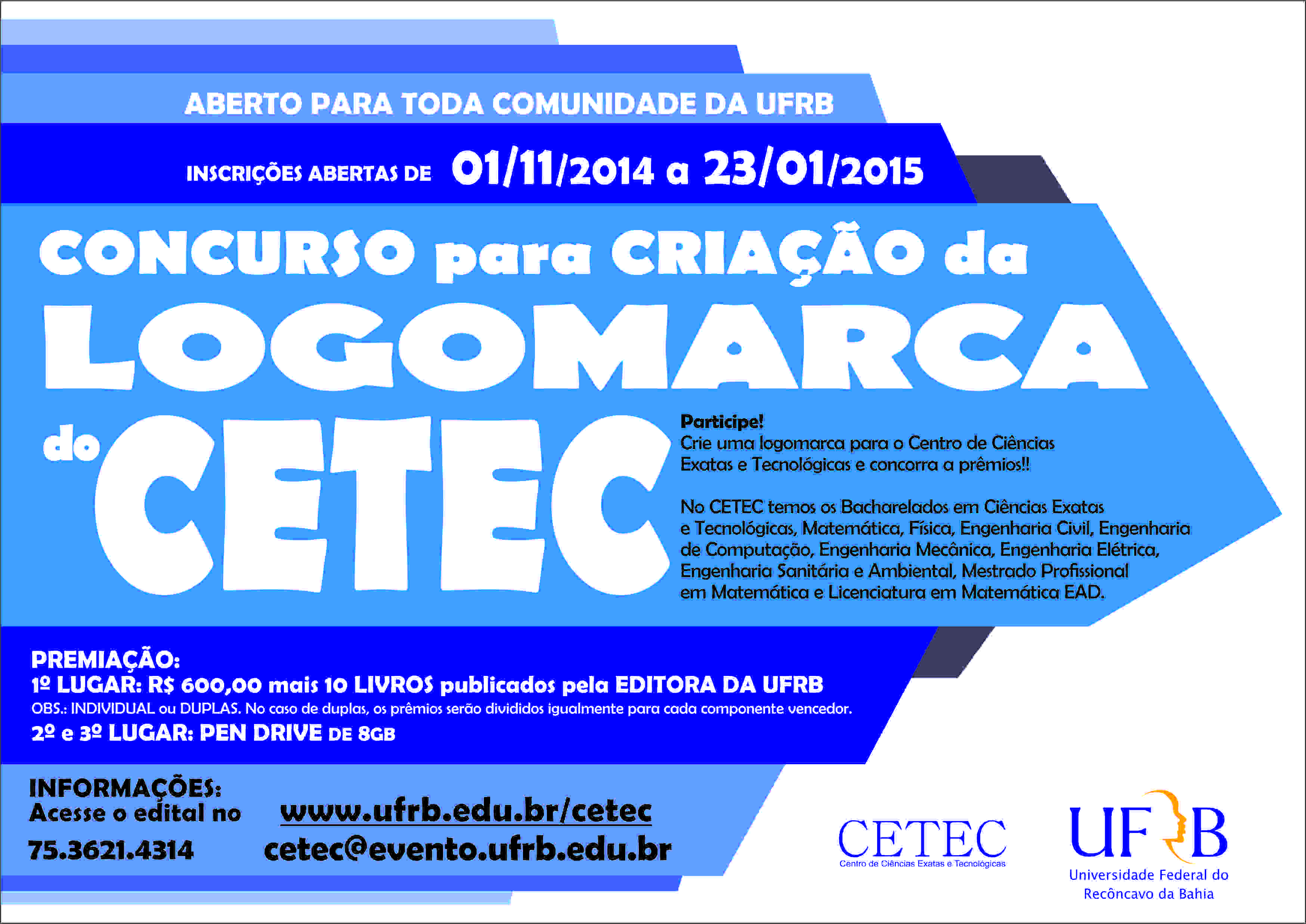 O Centro de Ciências Exatas e Tecnológicas (CETEC) da Universidade Federal do Recôncavo da Bahia (UFRB) torna público o edital referente ao concurso para a criação da sua logomarca. O concurso tem a finalidade de definir a logomarca que melhor consiga expressar a missão e a denominação do Centro.
