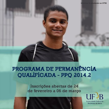 A Universidade Federal do Recôncavo da Bahia (UFRB), por meio da Pró-Reitoria de Políticas Afirmativas e Assuntos Estudantis (PROPAAE), divulga o edital de seleção do Programa de Permanência Qualificada (PPQ) 2014.2. No total, são ofertadas 264 vagas nas modalidades de auxílios vinculados à alimentação, deslocamento, moradia e projetos institucionais. As inscrições estão abertas no site da Propaae, de 24 de fevereiro até 06 de março.