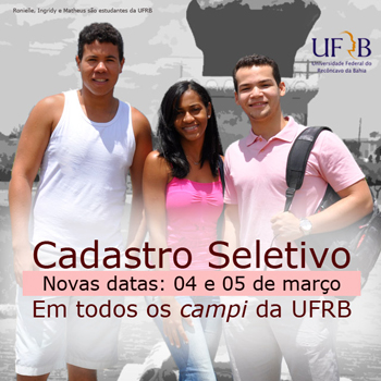 A Pró-Reitoria de Graduação (PROGRAD) da Universidade Federal do Recôncavo da Bahia (UFRB) comunica novo prazo para o Cadastro Seletivo 2015.1. Os candidatos devem comparecer pessoalmente para confirmar a sua participação no preenchimento das vagas remanescentes da UFRB, no qual comprovam a intenção de ocupar uma vaga na instituição, nos dias 04 e 05 de março.