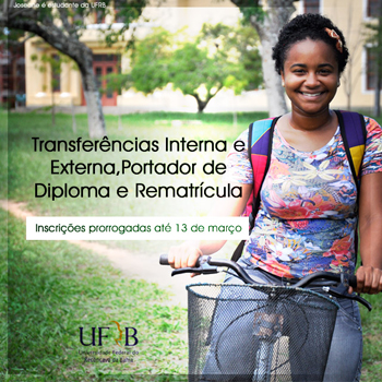A Pró-Reitoria de Graduação (PROGRAD) da Universidade Federal do Recôncavo da Bahia (UFRB) prorroga até 13 de março as inscrições do processo seletivo para preenchimento das vagas remanescentes dos cursos de graduação, nas modalidades de Transferências Interna e Externa, Rematrícula e Matrícula de Portador de Diploma, com ingresso previsto para 2015.1. As inscrições podem ser realizadas no Núcleo de Apoio Acadêmico (NUAPAC) do Centro de Ensino que o candidato pleitear a vaga.