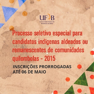 A Universidade Federal do Recôncavo da Bahia (UFRB), por meio da Pró-Reitoria de Graduação (PROGRAD), prorroga prazo para o processo seletivo especial para preenchimento de vagas, nos cursos de graduação da instituição, para estudantes indígenas aldeados ou remanescente de comunidades quilombolas, referente ao Edital Nº 08/2015. O novo prazo encerra nesta quarta-feira, 06 de maio.