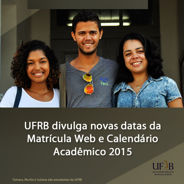 A Universidade Federal do Recôncavo da Bahia (UFRB) informa que foram alteradas as datas da matrícula web referente ao semestre letivo 2015.1 e divulga o Calendário Acadêmico 2015. O novo cronograma foi aprovado em reunião ordinária do Conselho Acadêmico (CONAC), realizada no dia 23 de abril.