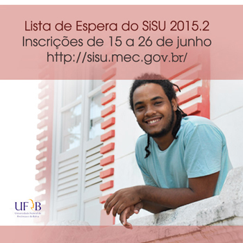 Os candidatos que não foram convocados na primeira opção da Chamada Única do Sistema de Seleção Unificada (SiSU) 2015.2 do Ministério da Educação (MEC) ainda podem garantir uma das vagas ofertadas pela Universidade Federal do Recôncavo da Bahia (UFRB). Segue até o dia 26 de junho o prazo de inscrição na Lista de Espera do SiSU para ingresso no semestre 2015.2. As inscrições devem ser realizadas na página do SiSU na internet.