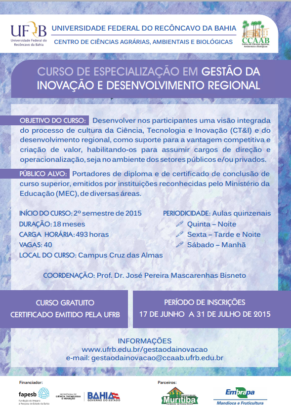 A Universidade Federal do Recôncavo da Bahia (UFRB), por meio da Pró-reitoria de Pesquisa, Pós-Graduação, Criação e Inovação (PPGCI), divulga a abertura das inscrições do processo seletivo para ingresso no Curso de Pós-Graduação Lato Sensu em Gestão da Inovação e Desenvolvimento Regional, no segundo semestre de 2015. O curso é ofertado pelo Centro de Ciências Agrárias, Ambientais e Biológicas (CCAAB) da UFRB em parceria com a Fundação de Amparo à Pesquisa do Estado da Bahia (FAPESB), Prefeitura Municipal de Muritiba e Empresa Brasileira de Pesquisa Agropecuária (EMBRAPA).