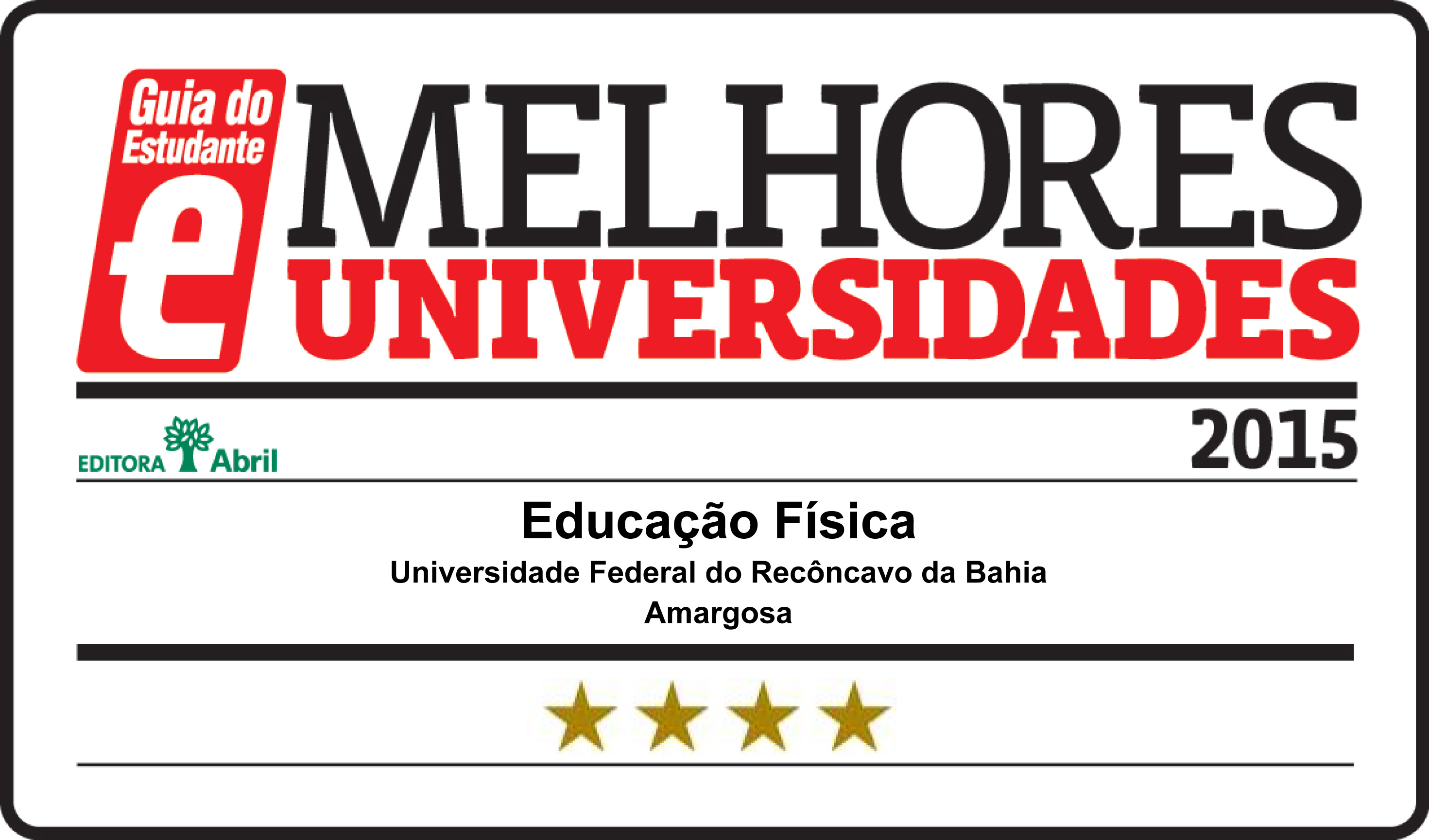 Quinze cursos de graduação da Universidade Federal do Recôncavo da Bahia (UFRB) foram avaliados pelo Guia do Estudante 2016 (GE) do Grupo Abril. Os cursos de Agronomia do Centro de Ciências Agrárias, Ambientais e Biológicas (CCAAB) e Educação Física do Centro de Formação de Professores (CFP) se destacaram e receberam quatro estrelas, correspondente ao conceito “muito bom”.