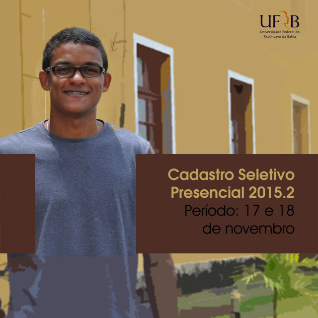 A Universidade Federal do Recôncavo da Bahia (UFRB), por meio de sua Pró-Reitora de Graduação (PROGRAD), informa sobre o período de Cadastro Seletivo presencial para ocupação das vagas remanescentes referentes ao segundo semestre letivo de 2015. As inscrições serão realizadas nos dias 17 e 18 de novembro de 2015, em todos os campi da UFRB.