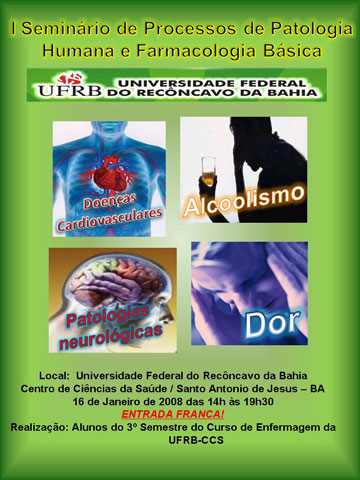 Realizado pelo curso de Enfermagem, mais especificamente pela turma do 3º Semestre, o I SEMINÁRIO DE PROCESSOS DE PATOLOGIA HUMANA E FARMACOLOGIA BÁSICA foi no dia 16 de janeiro, das 14 às 19:30h, no CCS em Santo Antonio de Jesus.