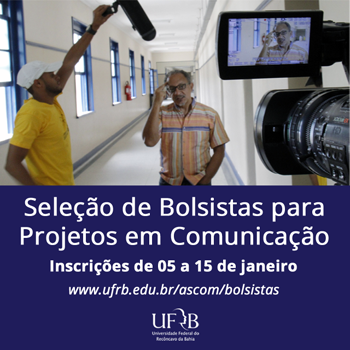 A Pró-Reitoria de Políticas Afirmativas e Assuntos Estudantis (PROPAAE) e a Assessoria de Comunicação (ASCOM) da Universidade Federal do Recôncavo da Bahia (UFRB) tornam público edital com vistas à seleção simplificada de 12 bolsistas para atuarem junto a projetos institucionais em comunicação. As inscrições seguem abertas até o dia 15 de janeiro, de forma presencial ou por meio do site www.ufrb.edu.br/ascom/bolsistas.