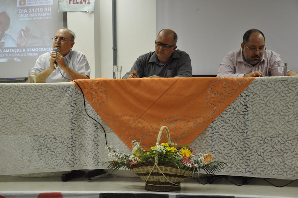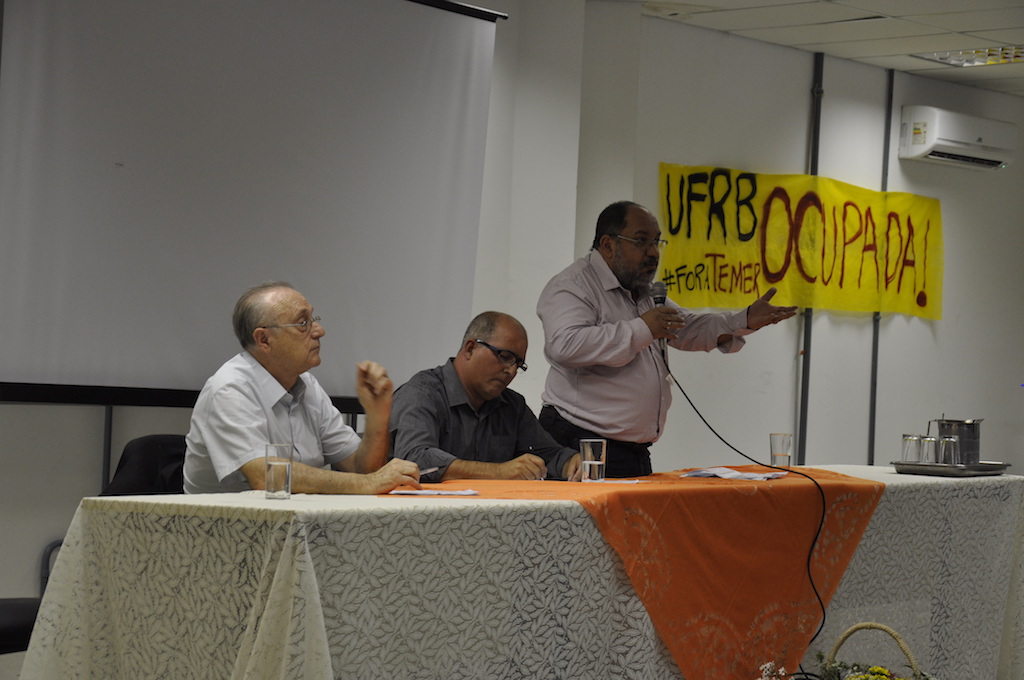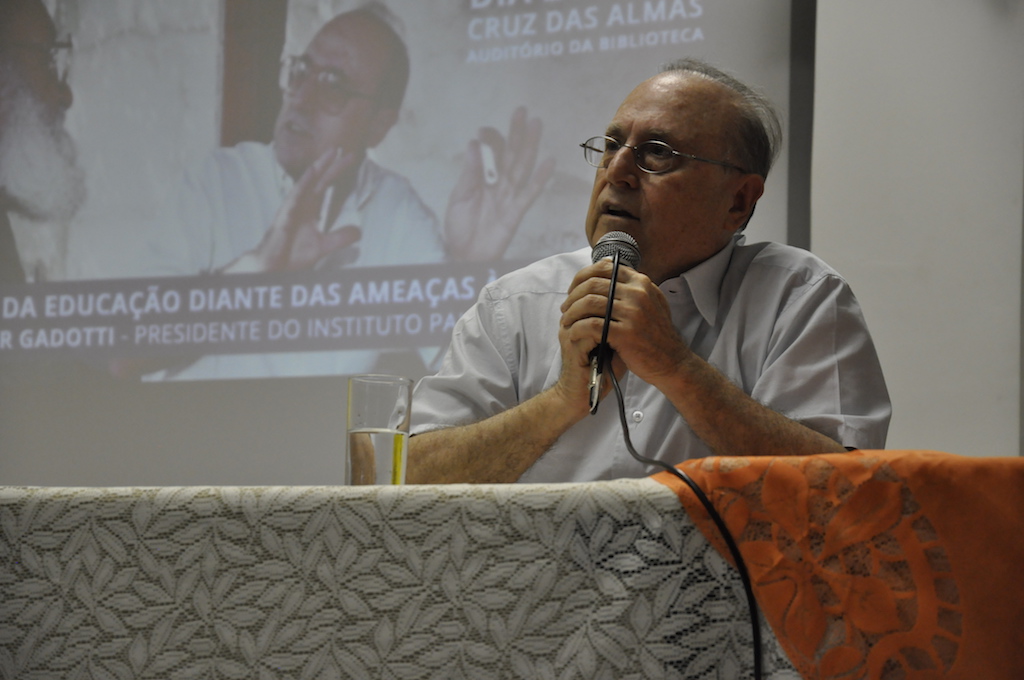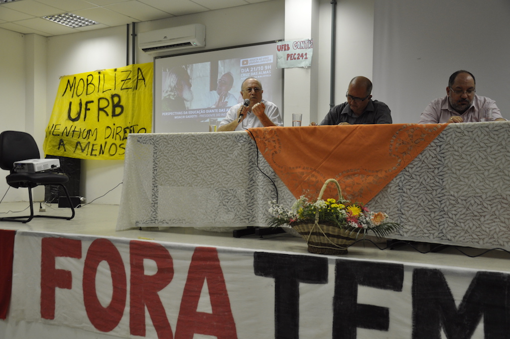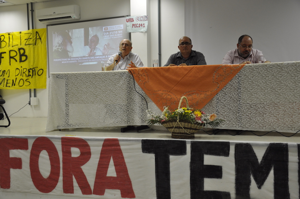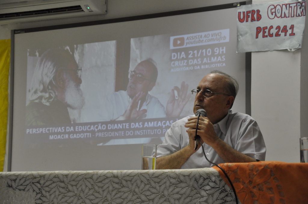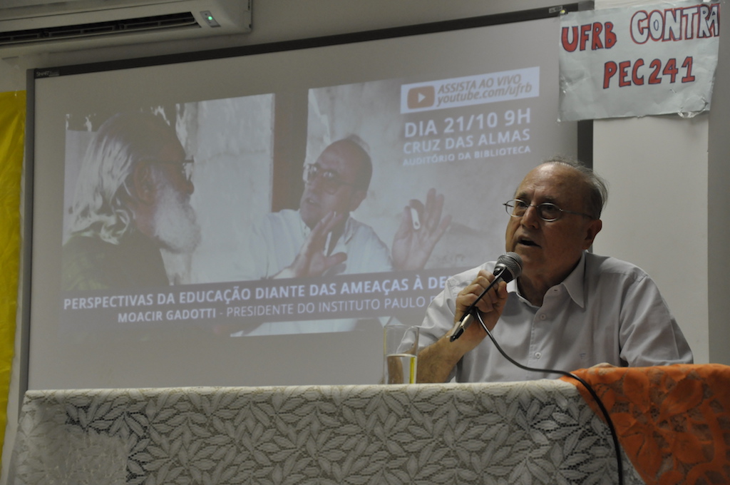 Moacir Gadotti - Na fala mais esperada do dia, o presidente do Instituto Paulo Freire iniciou agradecendo o convite da UFRB. “Essa universidade não vive um momento qualquer, porque ela não é uma universidade qualquer. Aqui está se travando uma luta por uma outra educação possível e necessária. E a luta é muito maior do que derrotas momentâneas”, disse. “Quanto mais a bota da opressão pisa no oprimido, mais o oprimido sente a sua capacidade de resistir. Os estudantes estão dando sua lição de democracia”, completou, referindo-se ao movimento de ocupação dos prédios da instituição pelos discentes em protesto contra as medidas de reforma para a Educação.