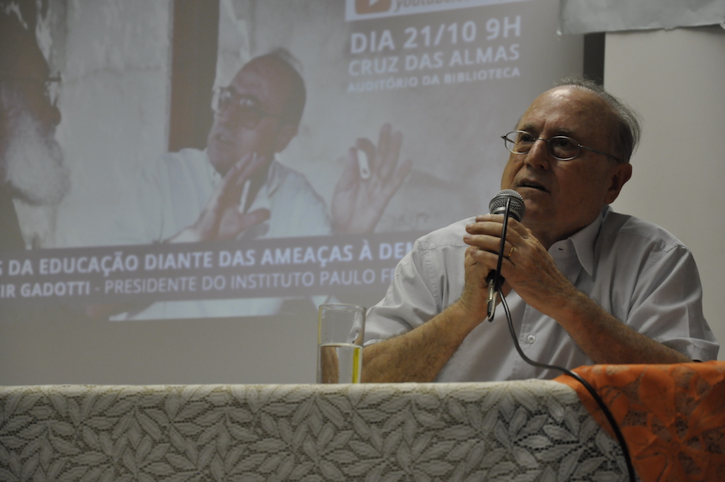 Em homenagem aos 95 anos de nascimento do educador Paulo Freire (1921-1997), a Universidade Federal do Recôncavo da Bahia (UFRB) recebeu na última sexta-feira, dia 21 de outubro, o professor Moacir Gadotti, presidente do Instituto Paulo Freire, para a conferência “Perspectivas da Educação Diante das Ameaças à Democracia”. O evento aconteceu no auditório da Biblioteca do Campus Cruz das Almas e teve como organizadores o Programa Todos Pela Alfabetização (TOPA) do Governo da Bahia e o Observatório Diversifica e a Pró-Reitoria de Extensão (PROEXT) da UFRB.