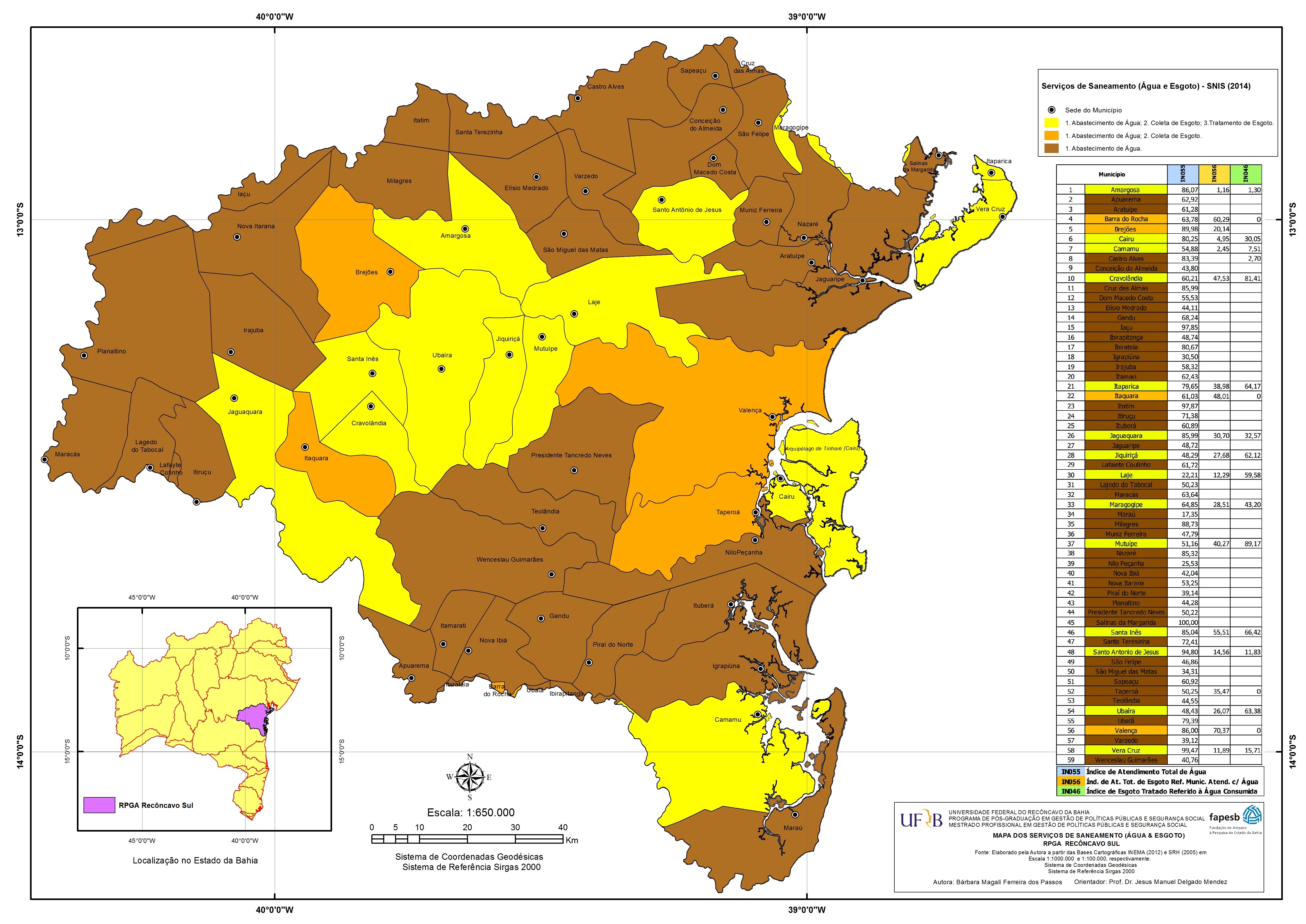 Dois mapas inéditos que retratam a situação hidrográfica e de serviços de saneamento básico da Região de Planejamento e Gestão das Águas (RPGA) Recôncavo Sul são parte dos resultados da dissertação de mestrado defendida pela pesquisadora Bárbara Magalí Passos no Programa de Pós-Graduação em Gestão de Políticas Públicas e Segurança Social, da Universidade Federal do Recôncavo da Bahia (UFRB). A pesquisa, apoiada pela Fundação de Amparo à Pesquisa do Estado da Bahia (FAPESB), teve como objetivo obter o nível de cobertura dos serviços de água e esgoto dos municípios e mapear detalhadamente a hidrografia dessa região.