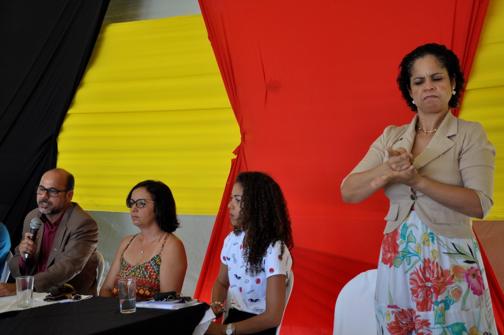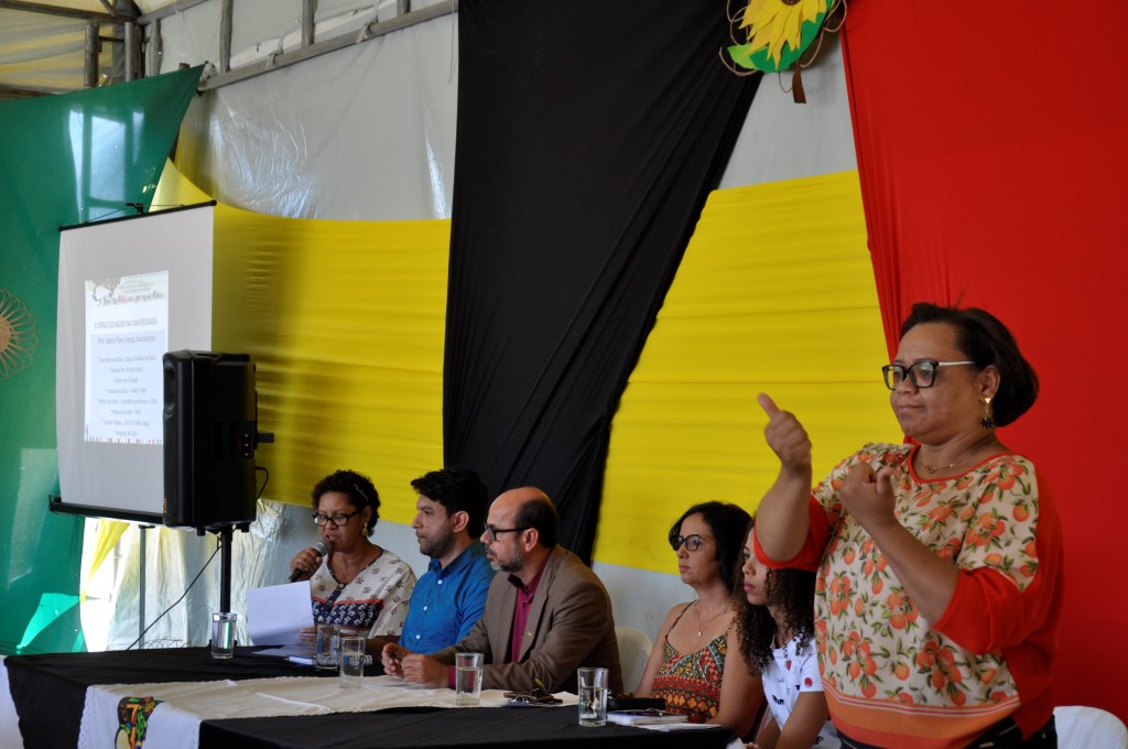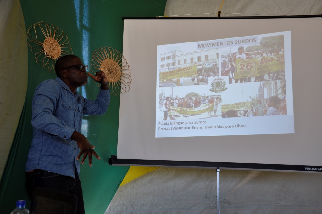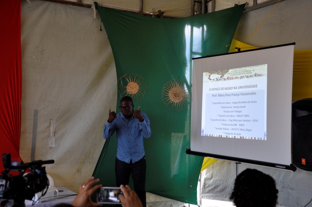 Na palestra “O Espaço do negro na Universidade”, relatada por uma intérprete em libras, Albery Vasconcelos destacou que a cultura dos surdos é visual e relatou suas dificuldades para vencer as barreiras educacionais ao longo de sua vida e inserção no mercado de trabalho.