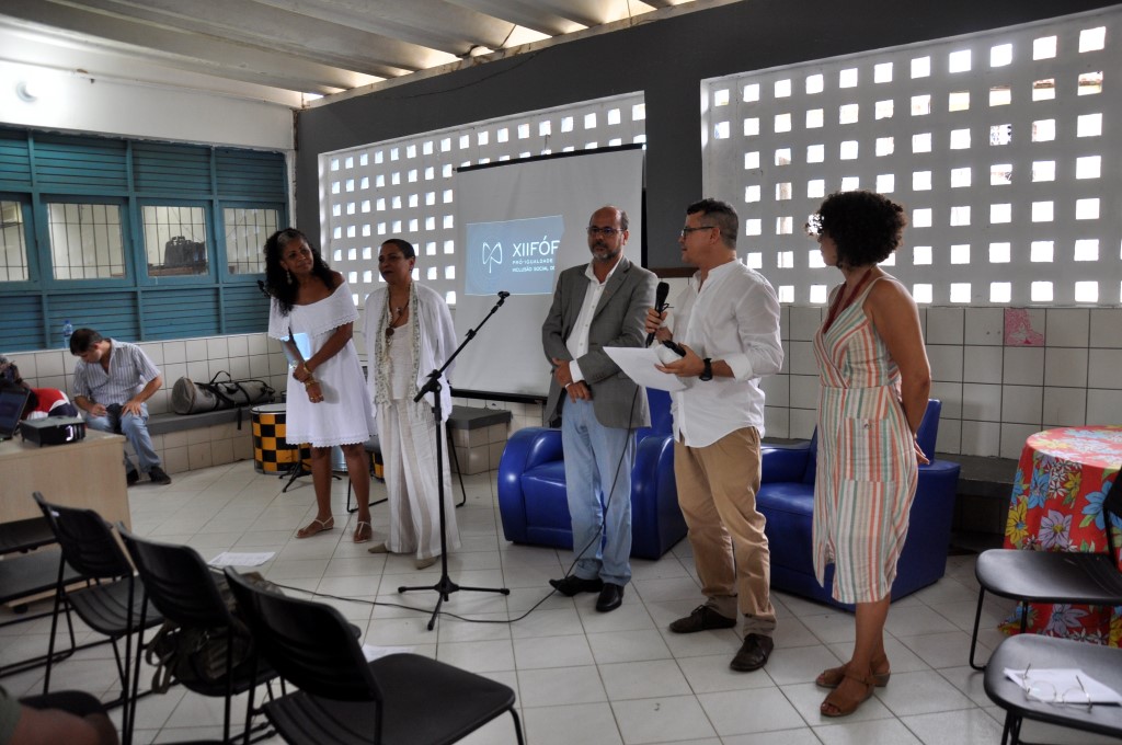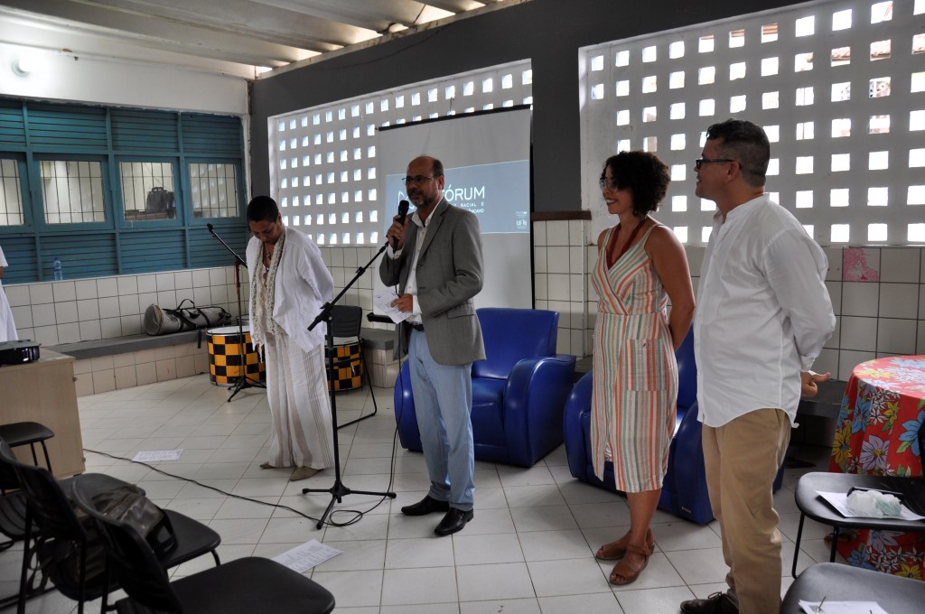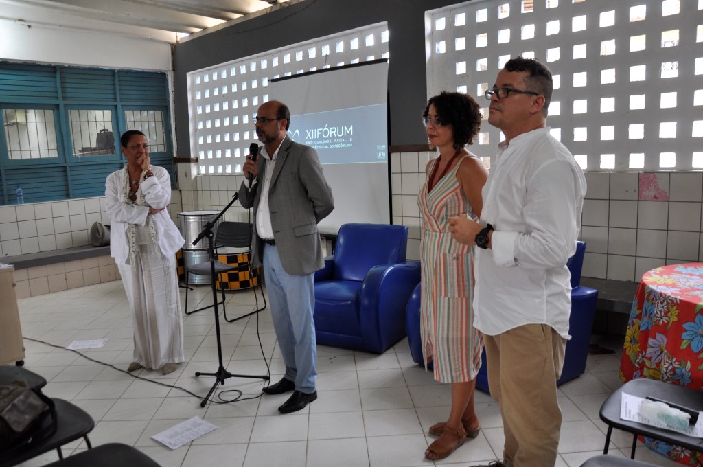 Em seguida, a mesa institucional foi composta pelo reitor da UFRB, Silvio Soglia; a vice-reitora, Georgina Gonçalves; o diretor do CECULT, Danillo Barata, e a vice-diretora, Laura Bezerra. Em sua fala, o diretor do CECULT destacou o Fórum como um evento fundador da Federal do Recôncavo e também do campus em Santo Amaro. “O Fórum foi a primeira celebração pública que tivemos. E, a todo o momento, temos trabalhado a concepção e estruturação desse Centro a partir das políticas de inclusão e igualdade”, afirmou Barata.