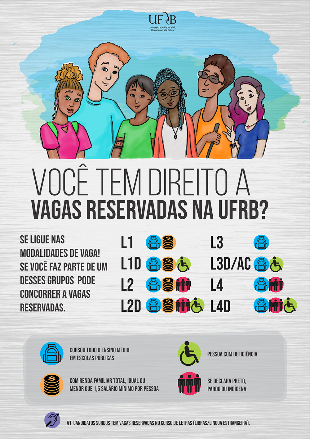 Reserva de Vagas - Na UFRB, há a reserva de 50% das vagas de ampla concorrência para surdos no curso de Letras/LIBRAS/Língua Estrangeira, ofertado em Amargosa. E de acordo com a Lei Nº 12.711/2012, conhecida como a Lei de Cotas, 50% das vagas são para estudantes de escolas públicas, dentre as quais há ainda a reserva para pretos, pardos, indígenas e pessoas com deficiência (atualizado pela Lei Nº 13.409/2016).