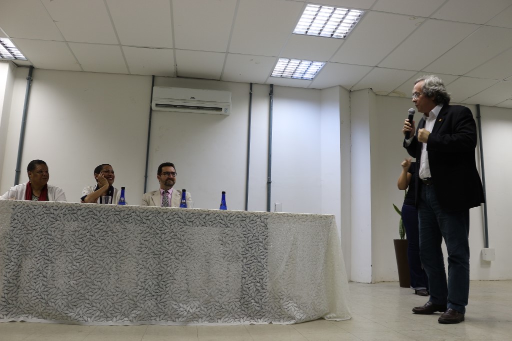 Para as discussões ocorridas na manhã da última quinta-feira, dia 29, no auditório da Biblioteca, Campus Cruz das Almas, estiveram presentes os reitores João Carlos Salles Pires da Silva, da Universidade Federal da Bahia (UFBA) e atual presidente da Associação Nacional dos Dirigentes das Instituições Federais de Ensino Superior (Andifes); Joana Angélica Guimarães da Luz, da Universidade Federal do Sul da Bahia (UFSB); Fábio Josué Souza dos Santos, da UFRB; e a ex-vice-reitora da UFRB, Georgina Gonçalves dos Santos.