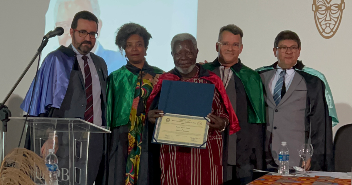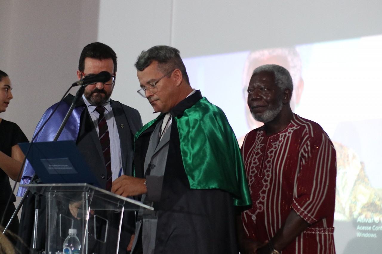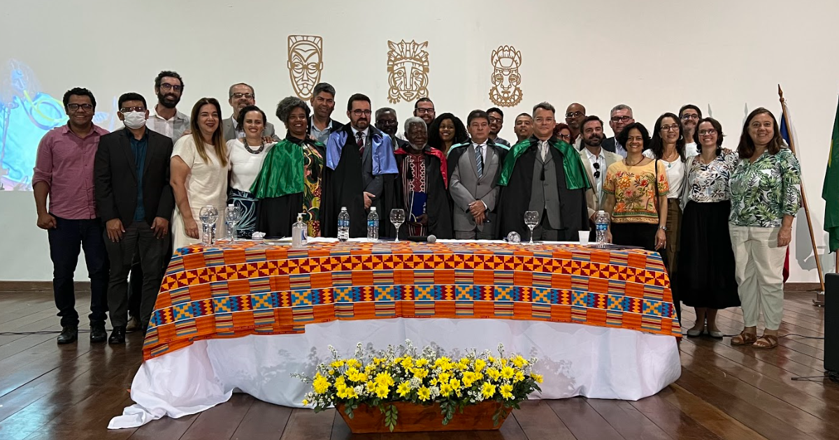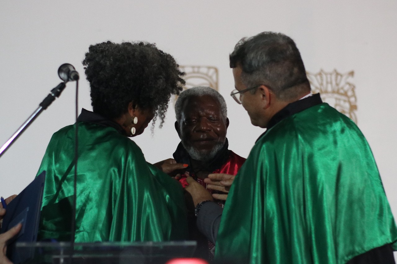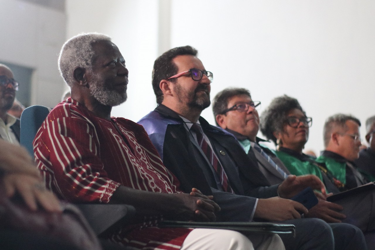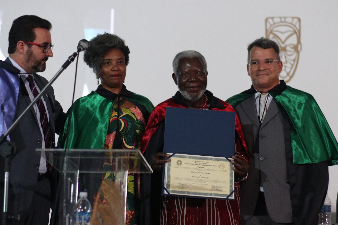 O educador negro, ativista da luta antirracista, intelectual e pesquisador de estudos negros e afro-brasileiros, Kabengele Munanga, 79 anos, recebeu o título de Doutor Honoris Causa da Universidade Federal do Recôncavo da Bahia (UFRB), em sessão solene do Conselho Universitário (CONSUNI), realizada na tarde de ontem, dia 8, no auditório do Centro de Artes, Humanidades e Letras (CAHL).