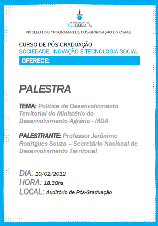 O curso de especialização "Sociedade, Inovação e Tecnologia Social" promove na próxima sexta, dia 10/02, a palestra do Professor Jerônimo Rodrigues, Secretário Nacional de Desenvolvimento Territorial do MDA. Todos estão convidados.